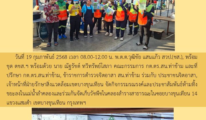 วันที่ 19 กุมภาพันธ์ 2568 เวลา 08.00-12.00 น. พ.ต.ต.วุฒิชัย แสนแก้ว สวป.(ชส.), พร้อมชุด ตชส.ฯ พร้อมด้วย นาย ณัฐรัชต์ ทวีทรัพย์โสภา คณะกรรมการ กต.ตร.สน.ท่าข้าม และที่ปรึกษา กต.ตร.สน.ท่าข้าม, ข้าราชการตำรวจจิตอาสา สน.ท่าข้าม ร่วมกับ ประชาชนจิตอาสา,เจ้าหน้าที่ฝ่ายรักษาสิ่งแวดล้อมเขตบางขุนเทียน จัดกิจกรรมรณรงค์และประชาสัมพันธ์ห้ามทิ้งขยะลงในแม่น้ำลำคลองและร่วมกันจัดเก็บวัชพืชในคลองลำรางสาธารณะในซอยบางขุนเทียน 14 แขวงแสมดำ เขตบางขุนเทียน กรุงเทพฯ