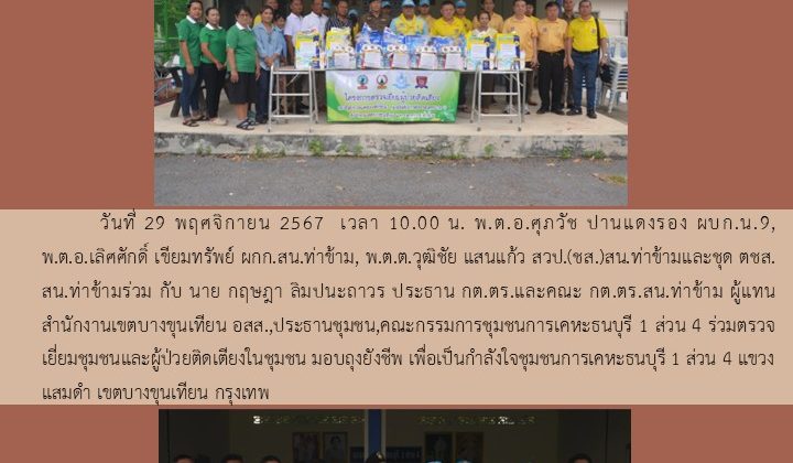 วันที่ 29 พฤศจิกายน 2567 เวลา 10.00 น. พ.ต.อ.ศุภวัช ปานแดงรอง ผบก.น.9,พ.ต.อ.เลิศศักดิ์ เขียมทรัพย์ ผกก.สน.ท่าข้าม, พ.ต.ต.วุฒิชัย แสนแก้ว สวป.(ชส.)สน.ท่าข้ามและชุด ตชส.สน.ท่าข้ามร่วม กับ นาย กฤษฎา ลิมปนะถาวร ประธาน กต.ตร.และคณะ กต.ตร.สน.ท่าข้าม ผู้แทนสำนักงานเขตบางขุนเทียน อสส.,ประธานชุมชน,คณะกรรมการชุมชนการเคหะธนบุรี 1 ส่วน 4 ร่วมตรวจเยี่ยมชุมชนและผู้ป่วยติดเตียงในชุมชน มอบถุงยังชีพ เพื่อเป็นกำลังใจชุมชนการเคหะธนบุรี 1 ส่วน 4 แขวงแสมดำ เขตบางขุนเทียน กรุงเทพ