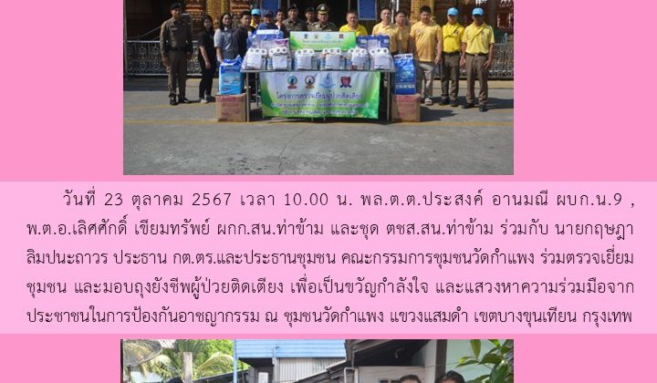 วันที่ 23 ตุลาคม 2567 เวลา 10.00 น. พล.ต.ต.ประสงค์ อานมณี ผบก.น.9 ,พ.ต.อ.เลิศศักดิ์ เขียมทรัพย์ ผกก.สน.ท่าข้าม และชุด ตชส.สน.ท่าข้าม ร่วมกับ นายกฤษฎา ลิมปนะถาวร ประธาน กต.ตร.และประธานชุมชน คณะกรรมการชุมชนวัดกำแพง ร่วมตรวจเยี่ยมชุมชน และมอบถุงยังชีพผู้ป่วยติดเตียง เพื่อเป็นขวัญกำลังใจ และแสวงหาความร่วมมือจากประชาชนในการป้องกันอาชญากรรม ณ ชุมชนวัดกำแพง แขวงแสมดำ เขตบางขุนเทียน กรุงเทพ