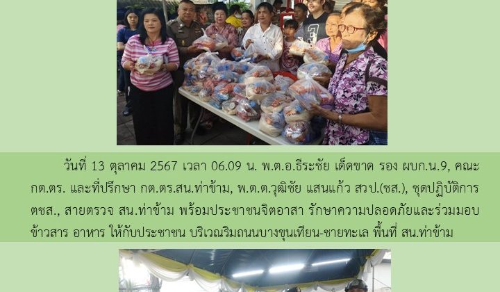 วันที่ 13 ตุลาคม 2567 เวลา 06.09 น. พ.ต.อ.ธีระชัย เด็ดขาด รอง ผบก.น.9, คณะ กต.ตร. และที่ปรึกษา กต.ตร.สน.ท่าข้าม, พ.ต.ต.วุฒิชัย แสนแก้ว สวป.(ชส.), ชุดปฏิบัติการ ตชส., สายตรวจ สน.ท่าข้าม พร้อมประชาชนจิตอาสา รักษาความปลอดภัยและร่วมมอบข้าวสาร อาหาร ให้กับประชาชน บริเวณริมถนนบางขุนเทียน-ชายทะเล พื้นที่ สน.ท่าข้าม