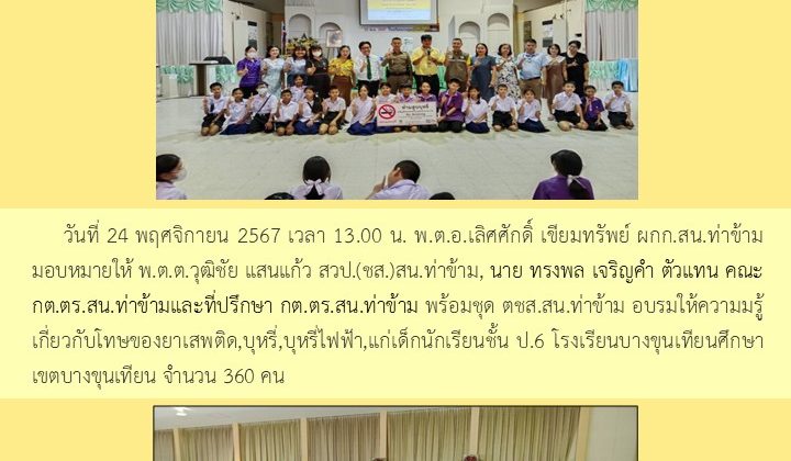 วันที่ 24 พฤศจิกายน 2567 เวลา 13.00 น. พ.ต.อ.เลิศศักดิ์ เขียมทรัพย์ ผกก.สน.ท่าข้าม มอบหมายให้ พ.ต.ต.วุฒิชัย แสนแก้ว สวป.(ชส.)สน.ท่าข้าม, นาย ทรงพล เจริญคำ ตัวแทน คณะ กต.ตร.สน.ท่าข้ามและที่ปรึกษา กต.ตร.สน.ท่าข้าม พร้อมชุด ตชส.สน.ท่าข้าม อบรมให้ความมรู้ เกี่ยวกับโทษของยาเสพติด,บุหรี่,บุหรี่ไฟฟ้า,แก่เด็กนักเรียนชั้น ป.6 โรงเรียนบางขุนเทียนศึกษา เขตบางขุนเทียน จำนวน 360 คน