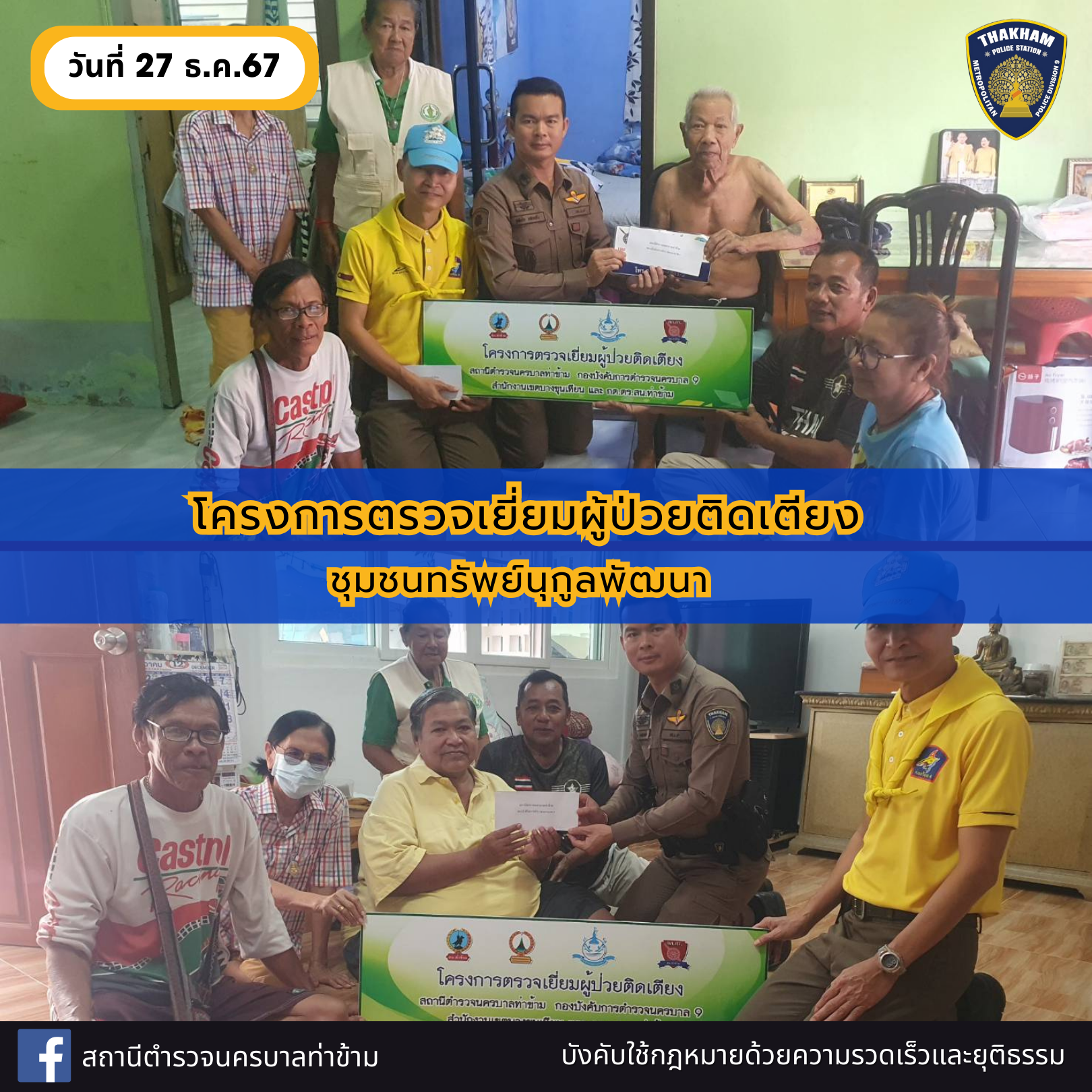 กิจกรรมตรวจเยี่ยมชุมชนและผู้ป่วยติดเตียง วันศุกร์ที่ 27 ธันวาคม พ.ศ. 2567 เวลา 13.00 น. พ.ต.อ.เลิศศักดิ์ เขียมทรัพย์ ผกก.สน.ท่าข้าม พ.ต.ท.สุระยุทธ ไขแสงจันทร์ สวป.รรท.รอง ผกก.ป.ฯ,มอบหมายให้ พ.ต.ต.วุฒิชัย แสนแก้ว สวป.(ชส.)สน.ท่าข้าม และชุด จิตอาสา ตชส.สน.ท่าข้าม อสส.,ประธานชุมชน คณะกรรมการชุมชนทรัพย์นุกูลพัฒนา ร่วมตรวจเยี่ยมชุมชน และผู้ป่วยติดเตียง พร้อมมอบถุงยังชีพ เพื่อเป็นขวัญกำลังใจ และแสวงหาความร่วมมือจากประชาชนในการป้องกันอาชญากรรม