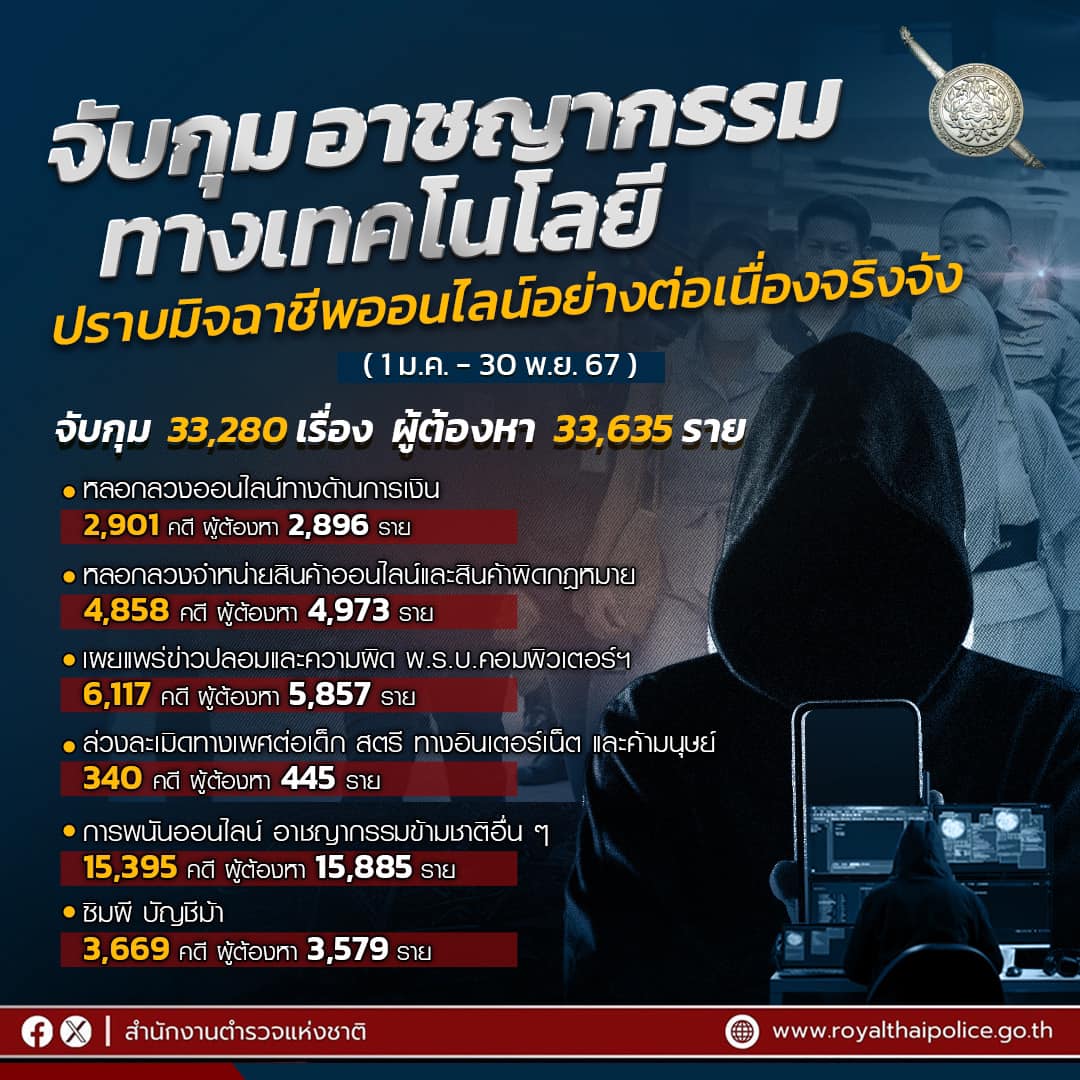 สำนักงานตำรวจแห่งชาติสรุปผลงานประจำปี 2567 จับกุมคดีอาญาได้เกือบ 5 แสนคดี คดียาเสพติดกว่า 2 แสนคดี คดีออนไลน์อีกว่า 3 หมื่นคดี พร้อมเดินหน้าปราบปรามอาชญากรรมทุกประเภท เพื่อความผาสุกแก่ประชาชน👮♂️