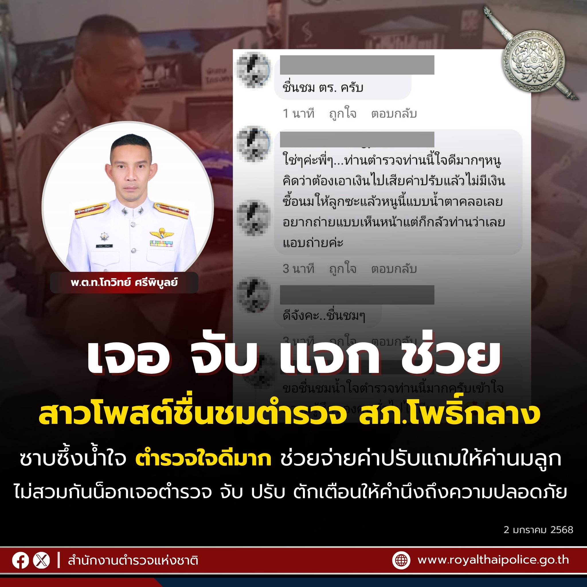 สาวโคราชชื่นชม ซึ้งน้ำใจ ตำรวจโพธิ์กลาง “เจอ จับ แจก ช่วยเหลือ” “หนูขอบคุณพี่ตำรวจ” หญิงสาวคนหนึ่ง โพสต์ใน “กลุ่มข่าวคนโคราชบ้านเอ็ง” ซาบซึ้งน้ำใจ ชื่นชมตำรวจดี “พี่ตำรวจโคราช”
