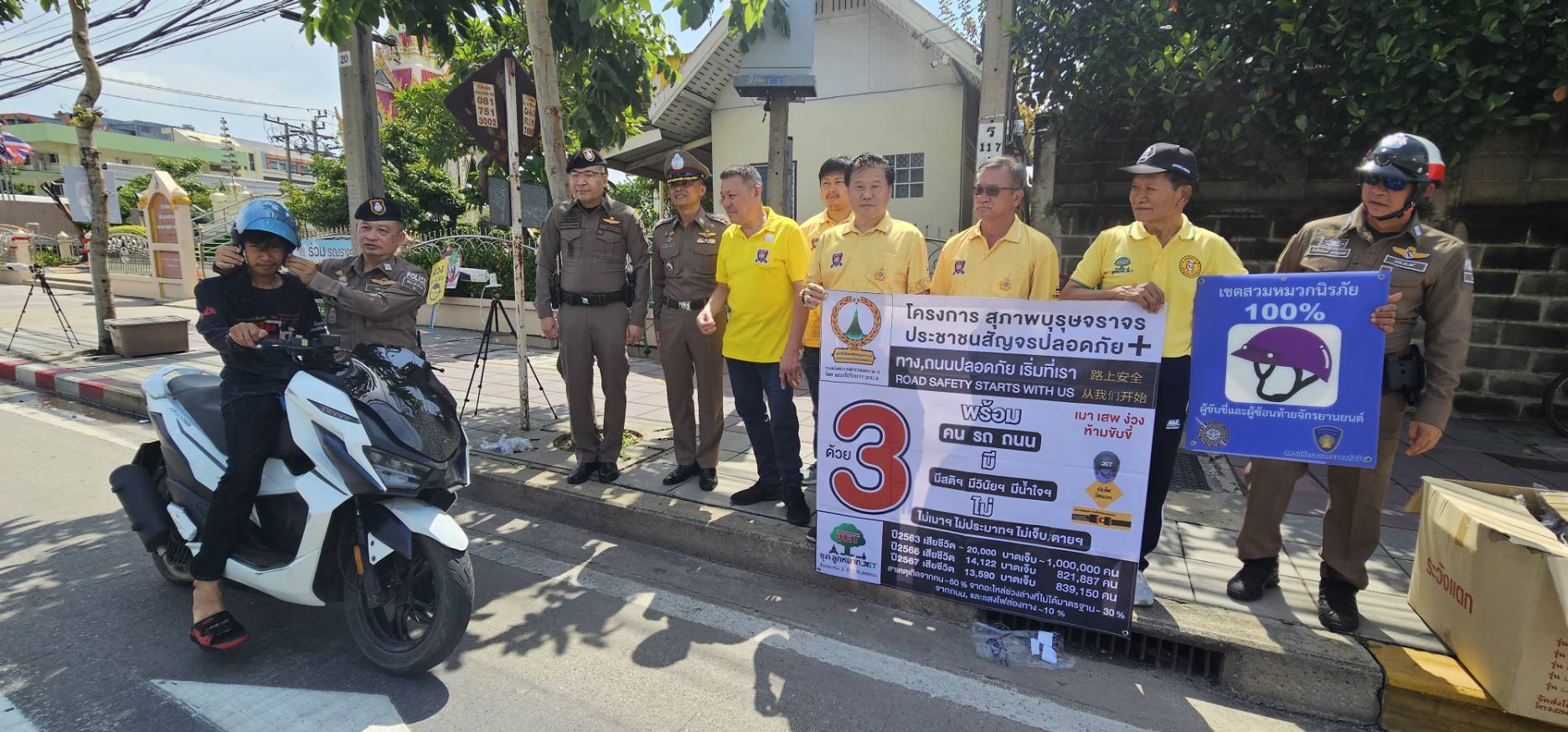 วันที่ 6 มิถุนายน 2568 เวลา 10.00 น. ภายใต้การนำของ พ.ต.อ.อชิรวิทย์ ทองจันดี รอง ผบก น.9 และพ.ต.อ.วิชยานนท์ เอกตาแสง ผกก.สน.ท่าข้าม,พ.ต.ท.นันทวิทย์ เจริญพร รอง ผกก.จร.สน.ท่าข้ามพ.ต.ท.อิทธิพันธ์ หาญเวช สว.จร.สน.ท่าข้าม,นายกฤษฎา ลิมปนะถาวร และคณะ กต.ตร.สน.ท่าข้ามสำนักงานขนส่ง พื้นที่ 1, ผู้ขับขี่จักรยานยนต์สาธารณะพร้อมเจ้าหน้าที่จราจร สน.ท่าข้าม รณรงค์ประชาสัมพันธ์โครงการถนนปลอดภัย สวมหมวกนิรภัย 100% และแจกหมวกนิรภัยแก่ประชาชน บริเวณศาลท้าวมหาพรหม ถนนบางขุนเทียนชายทะเล เพื่อความปลอดภัย และป้องกันอุบัติเหตุทางถนน