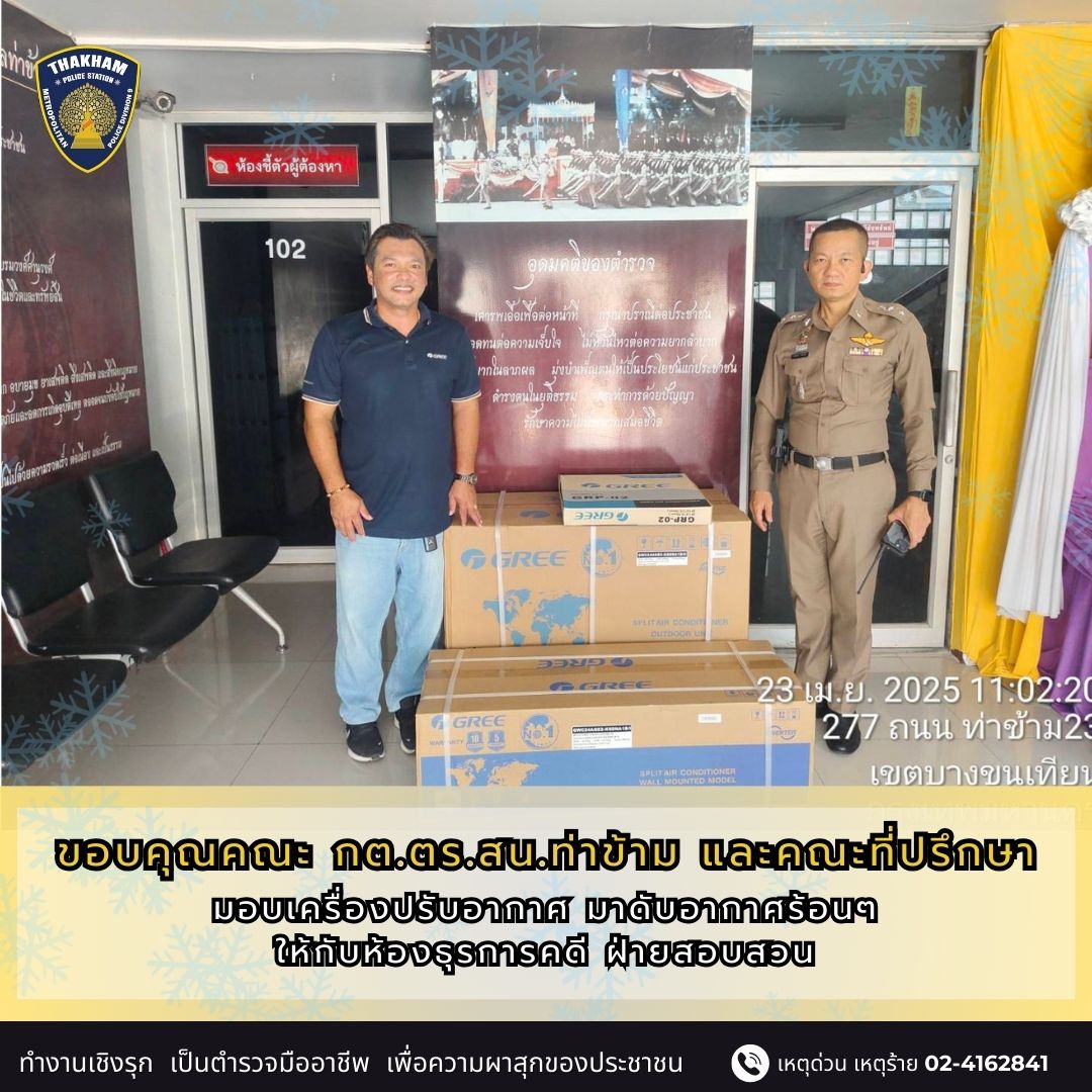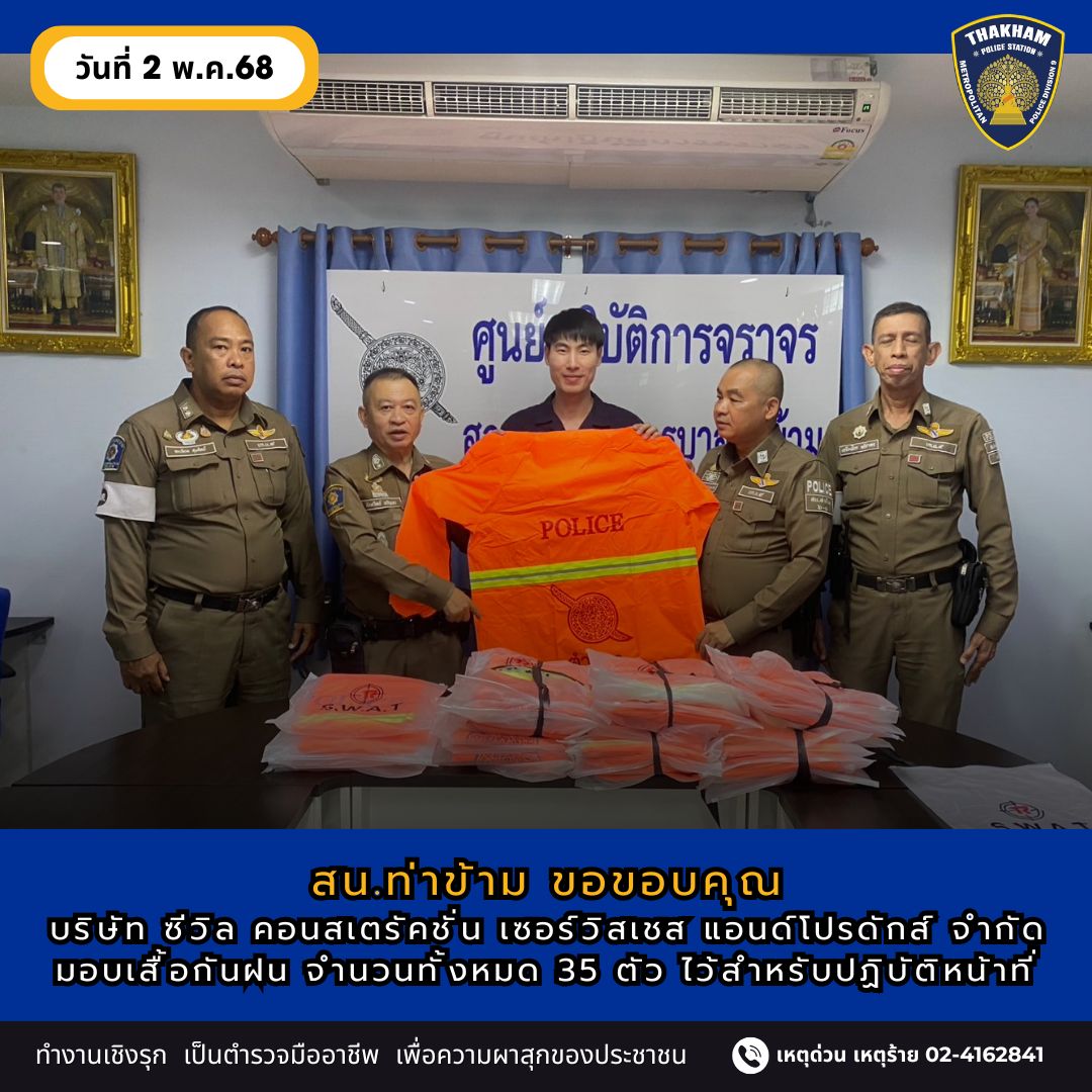 วันที่ 2 พ.ค.2568 เวลา 12.00 น.บริษัท ซีวิล คอนสเตรัคชั่น เซอร์วิสเชส แอนด์โปรดักส์ จำกัดเป็นตัวแทนมอบเสื้อกันฝนให้กับเจ้าหน้าที่ตำรวจจราจร สน.ท่าข้ามโดย พ.ต.ท.นันทวิทย์ เจริญพร รอง ผกก.จร.สน.ท่าข้าม พ.ต.ท.อิทธิพันธ์ หาญเวช สว.จร.สน.ท่าข้าม พร้อมเจ้าหน้าที่ตำรวจจราจร สน.ท่าข้ามเป็นตัวแทนรับมอบเสื้อกันฝน จำนวนทั้งหมด 35 ตัว สน.ท่าข้าม ขอขอบคุณ บริษัท ซีวิล คอนสเตรัคชั่น เซอร์วิสเชส แอนด์โปรดักส์ จำกัด ไว้ ณ