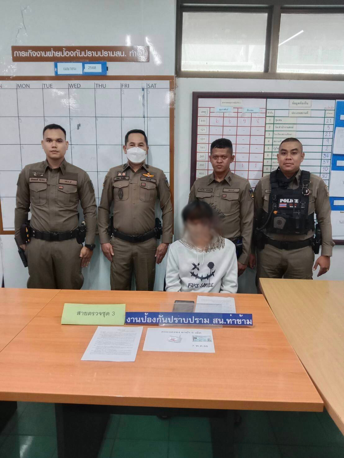 วันนี้ 7 พ.ค.68 (เวลาประมาณ 11.25 น.) เจ้าพนักงานตำรวจสถานีตำรวจนครบาลท่าข้าม ภายใต้การอำนวยการของ พ.ต.อ.วิชยานนท์ เอกตาแสง ผกก.สน.ท่าข้าม, พ.ต.ท.ศิวัช พุ่มนุ่ม รอง ผกก.ป.สน.ท่าข้าม, พ.ต.ท.มงคล สังข์เพิ่ม สวป.สน.ท่าข้าม เจ้าหน้าที่ชุดจับกุมประกอบด้วย ร.ต.อ.วิชญ์วศิน ธนินสกุล รอง สวป.สน.ท่าข้าม,จ.ส.ต.วิเชียร ปังกะสัง,จ.ส.ต.วาทิต ธรรมสิทธิ์,ส.ต.ท.พีระพงศ์ จินายงค์ ผบ.หมู่ (ป.) สน.ท่าข้าม2.สถานที่เกิดเหตุ ป้ายรถประจำทางปากซอยพระราม2/47 แขวงแสมดำ เขตบางขุนเทียน กรุงเทพ3.ได้ร่วมกันทำการจับกุมตัว นายศักดิ์สิทธิ์