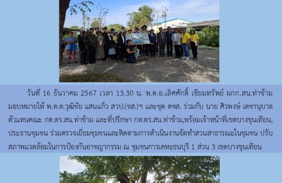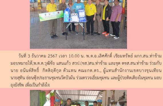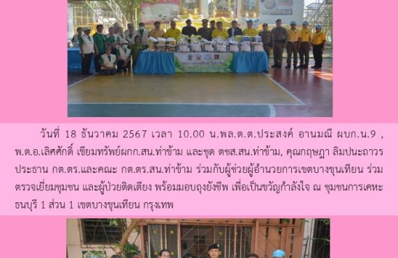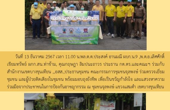 พล.ต.ต.ประสงค์ อานมณี ผบก.น.9 พ.ต.อ.เลิศศักดิ์ เขียมทรัพย์ ผกก.สน.ท่าข้าม พ.ต.ต.วุฒิชัย แสนแก้ว สวป.(ชส.)สน.ท่าข้ามและชุด ตชส.สน.ท่าข้าม ร่วมกับ คุณกฤษฎา ลิมปนะถาวร ประธาน กต.ตร.และคณะ อสส.,ประธานชุมชน คณะกรรมการชุมชนข้าราชการตำรวจ บก.น.9 ร่วมตรวจเยี่ยมผู้ป่วยติดเตียง(ร.ต.ท.ทวีพงษ์ ศรีสูงเนิน รอง สว.สกบ.บก.น. 9) มอบถุงยังชีพ เพื่อเป็นขวัญกำลังใจ ณ อาคารที่พัก ข้าราชการตำรวจ บก.น.9 แขวงบางมด เขตจอมทอง กรุงเทพ ฯ